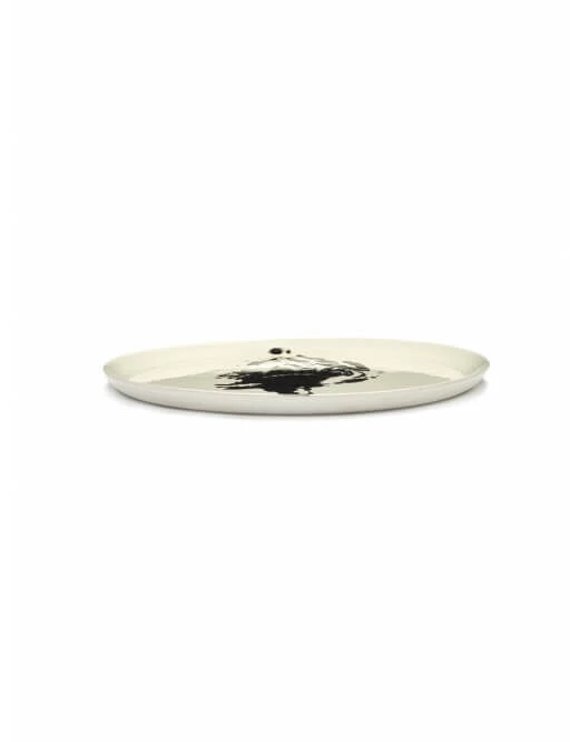 Het Serax Feast by Ottolenghi serveerbord heeft een diameter van 35 cm en is 2 cm hoog. Het aardewerken bord is wit van kleur en heeft een zwarte schildering.