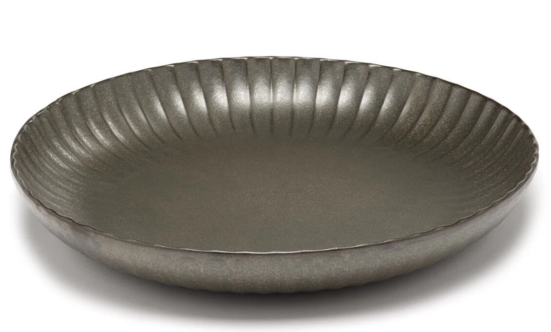 De serveerschaal M van Serax INKU heeft een diameter van 32 cm en is 5 cm hoog, en is aan de rand voorzien van een decoratief ribbelpatroon. De schaal is gemaakt van steengoed (aardewerk) en is groen geglazuurd. Gebruik voor het serveren van gerechten.