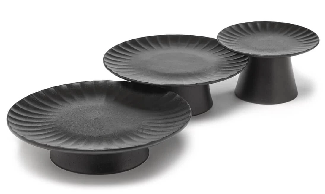 Het taartplateau M van Serax INKU heeft een diameter van 21 cm en is 8 cm hoog, en is aan de rand voorzien van een decoratief ribbelpatroon. Het plateau is gemaakt van steengoed (aardewerk) en is zwart geglazuurd. Gebruik voor het serveren van diverse soorten gebak, bonbons en taartjes.