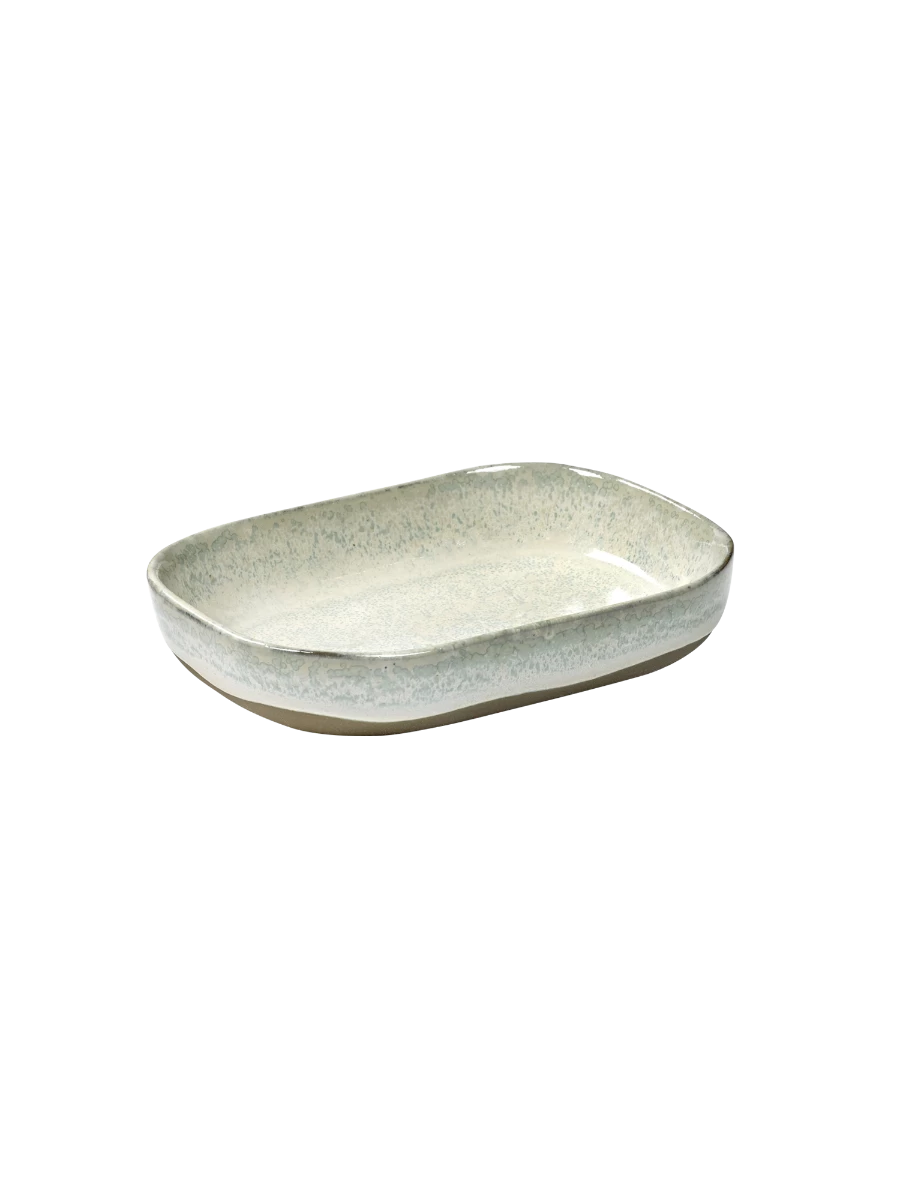 Het rechthoekige Merci diepe bord van Serax is gemaakt van gebroken-witgeglazuurd zandsteen. Het bord is 14,5 cm lang, 10,5 cm breed en 3 cm hoog.Â