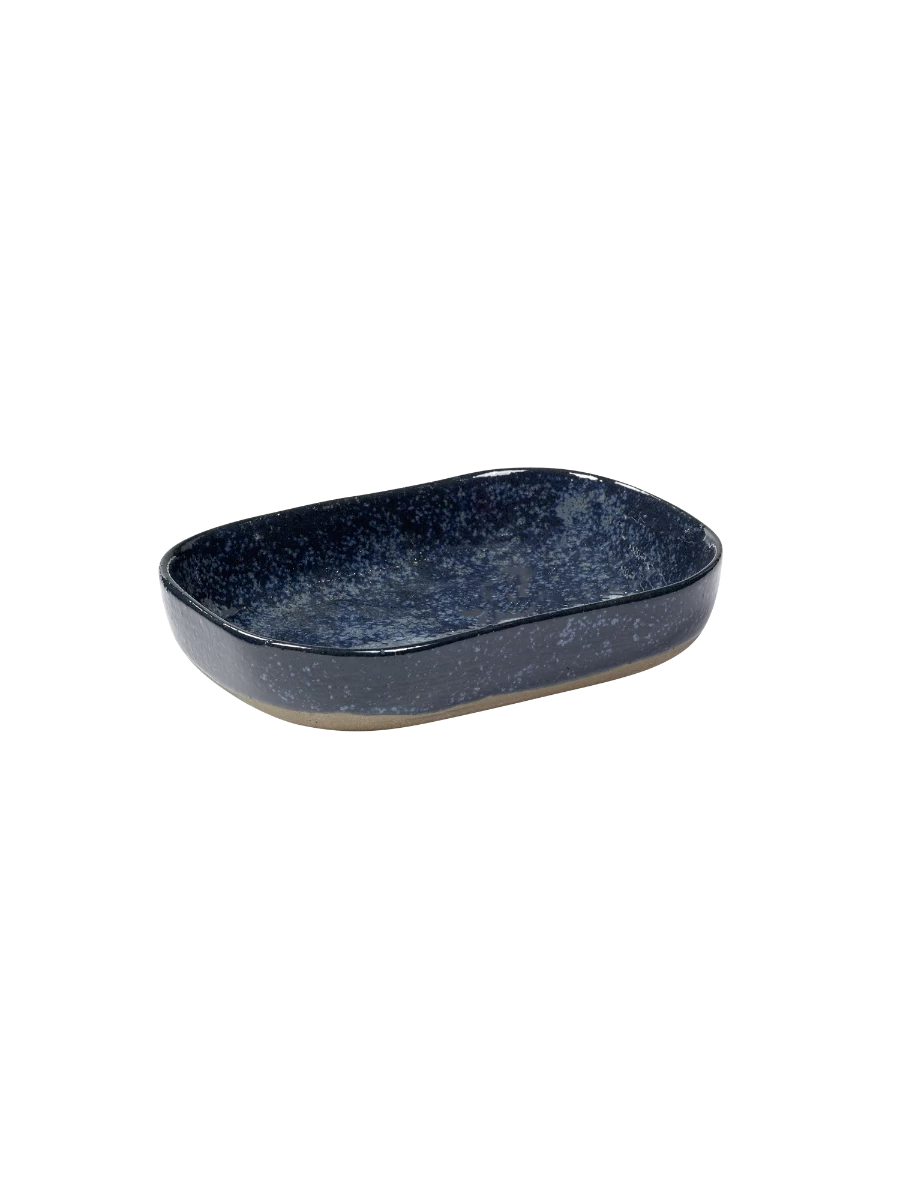 Het rechthoekige Merci diepe bord van Serax is gemaakt van grijsblauw geglazuurd zandsteen. Het bord is 14,5 cm lang, 10,5 cm breed en 3 cm hoog.