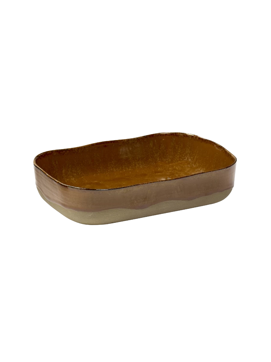 De rechthoekige Merci schaal van Serax is gemaakt van okerbruin geglazuurd zandsteen. Deze schaal is 23 cm lang, 15 cm breed en 5 cm hoog.
