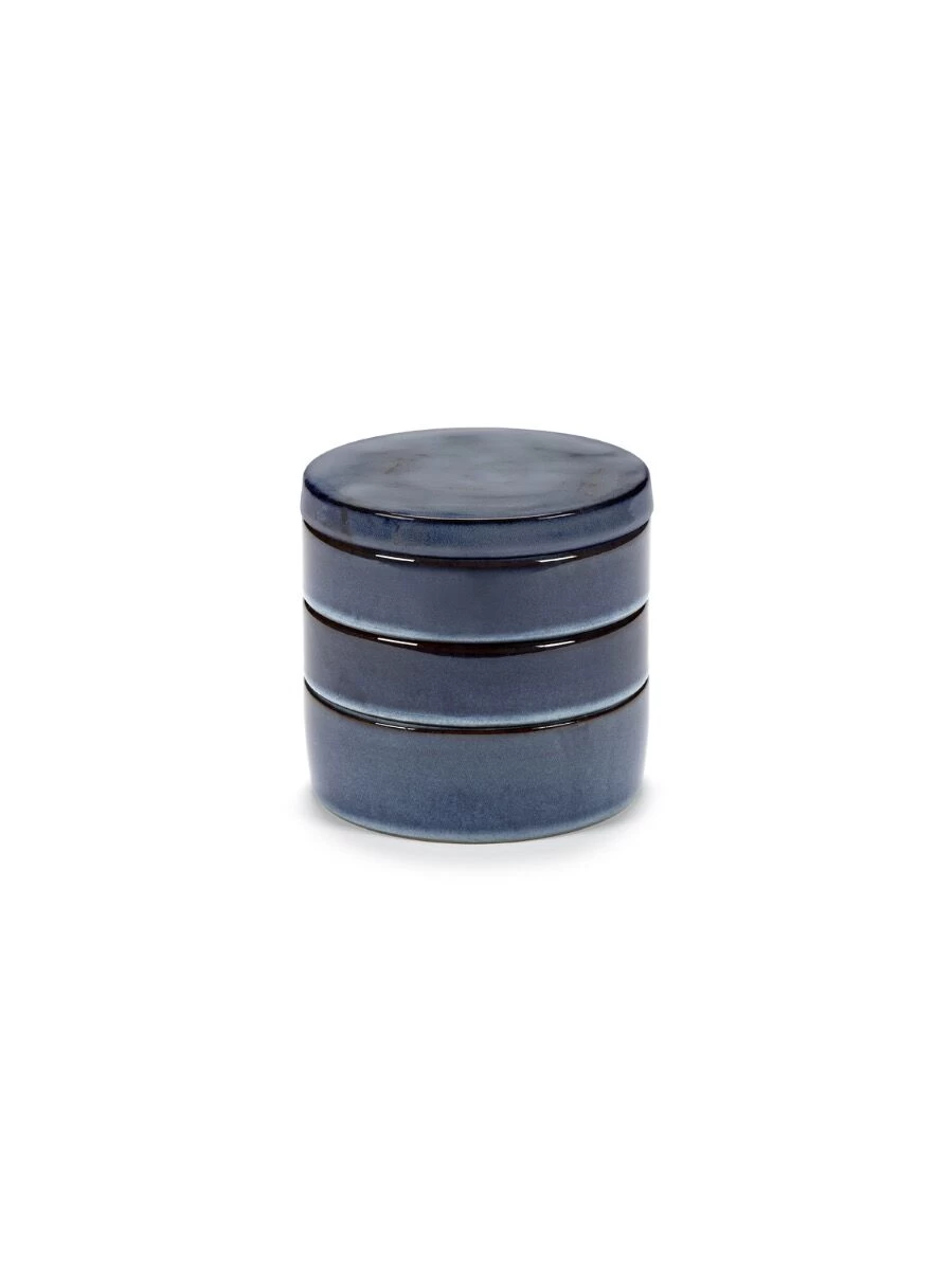 De Serax Pure kommenset is gemaakt van Dark Blue Glazed, donkerblauw, keramiek. De kommen hebben een diameter van 14 cm, in totaal heeft de set een hoogte van 15 cm. Ontworpen door Pascale Naessens. De kommen zijn los te gebruiken of als voorraadpot te gebruiken inclusief de deksel. De set bestaat uit 3 kommen en 1 deksel.